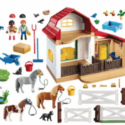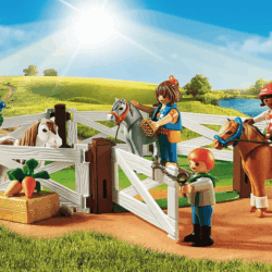 Comprend trois personnages, trois poneys, un box deux places, un box pour un poney et un enclos modulable. Les portes des boxes s’ouvrent vers l’enclos. Vaste espace pour les poneys et la nourriture.