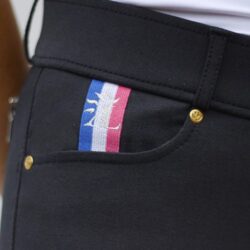 Ce modèle ‘grip’ arbore des basanes antidérapantes en silicone, discrètes et élégantes. A l’avant: 2 poches avec une superbe broderie aux couleurs de la France sur la poche droite. A l’arrière: 2 fausses poches et une belle broderie en fil métallisé.