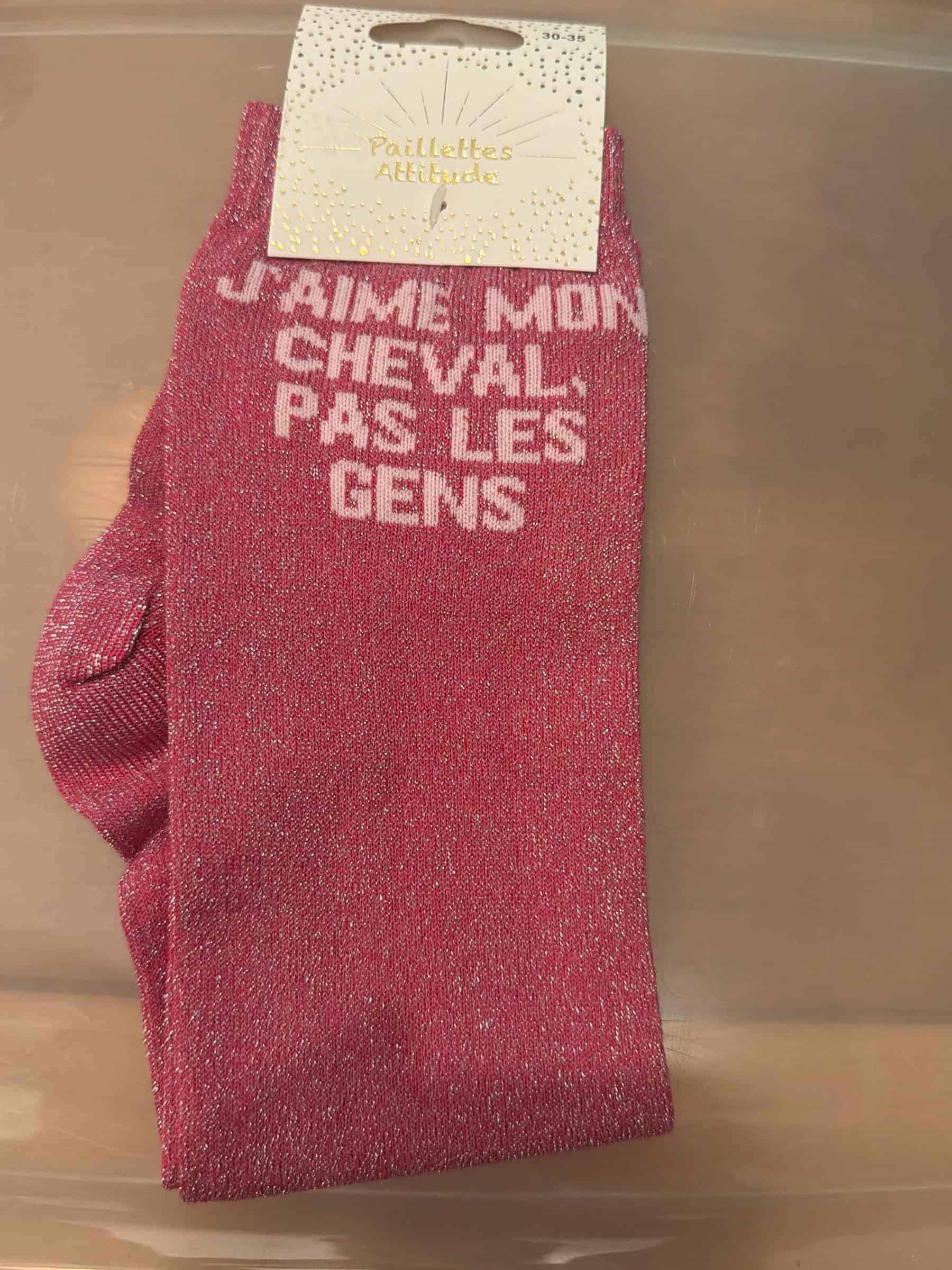 Les Chaussettes enfants Paillettes Attitudes « J’aime mon cheval pas les gens » Fushia affichent un message drôle et réaliste, parfait pour le quotidien à l’écurie ou lors de stages.