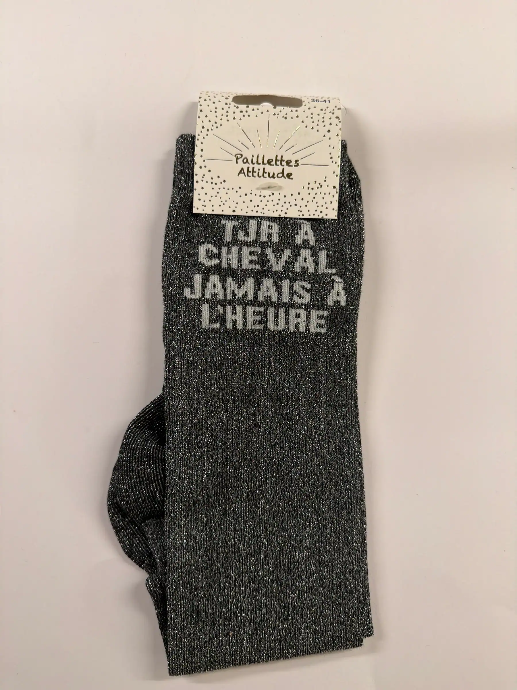 🎯 Pourquoi choisir les Chaussettes adultes Paillettes Attitudes « Tjs à cheval jamais à l’heure » Noires ?