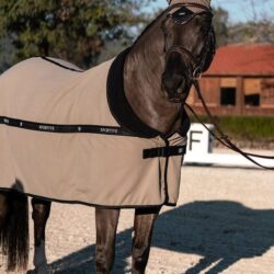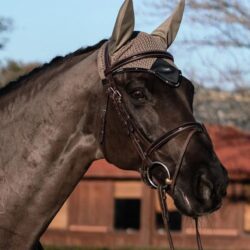 Bonnet luxueux au crochet dans un design élégant beige et noir. Orné d’un beau passepoil noir et d’un badge ES doré clair. Le bonnet offre à la fois une protection contre les insectes et une réduction du bruit. Il a un tissu élastique près des oreilles pour un minimum de fiel. S’accorde parfaitement avec le tapis de selle de la même collection.