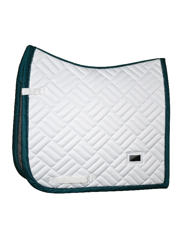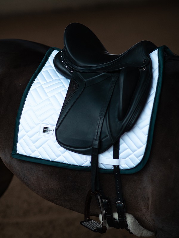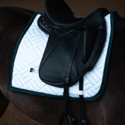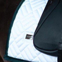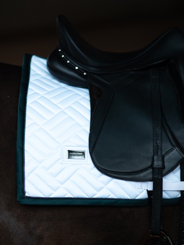 Tapis de selle élégant avec une matelassage moderne en blanc avec des détails verts et noirs spectaculaires.