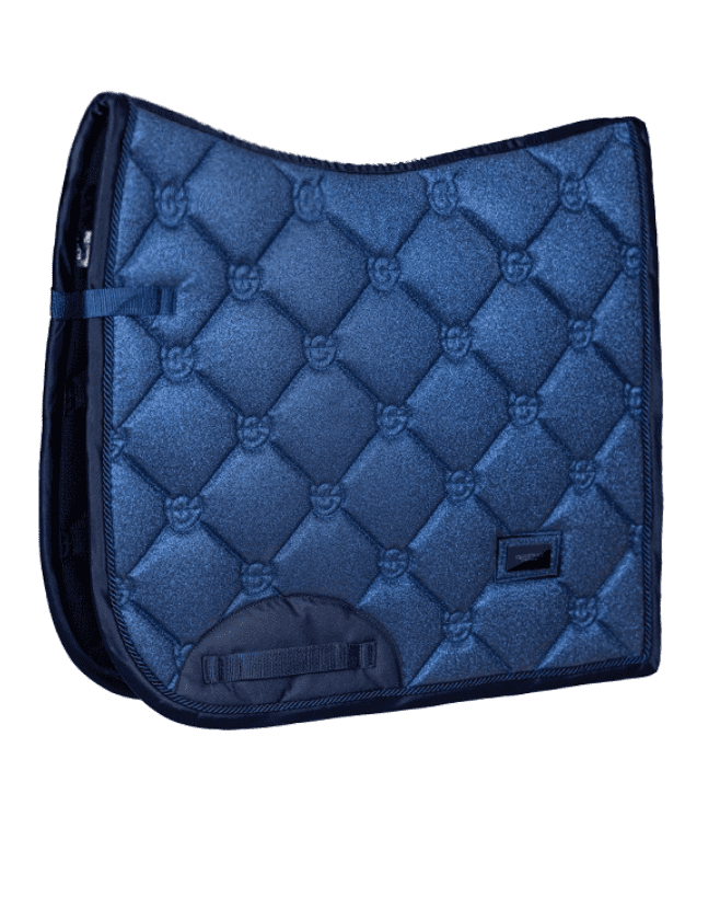 Tapis de selle élégant en paillettes bleues avec des détails bleu marine.