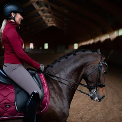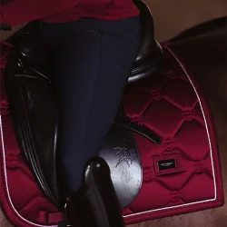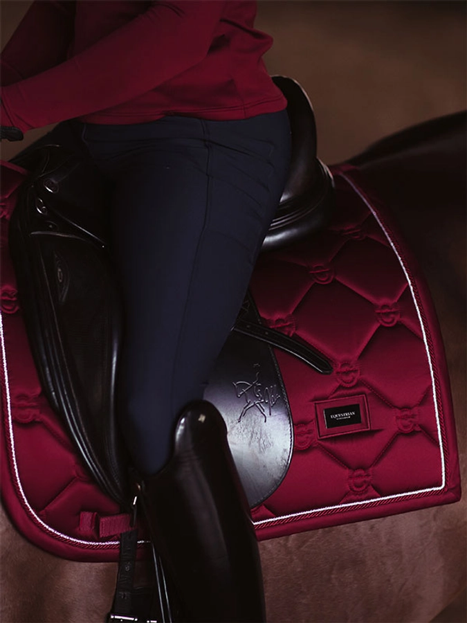 Nous sommes très heureux de vous présenter le tapis de selle de dressage ‘Leather Deluxe Silver’, maintenant dans un nouveau matériau. Joli tapis de selle de dressage bleu marine avec détails en cuir marron. Convient parfaitement pour une séance d’entraînement et s’accorde parfaitement avec des bottes marron ou une selle marron.