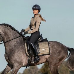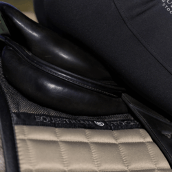 Tapis de selle sportif de couleur beige avec des détails noirs.