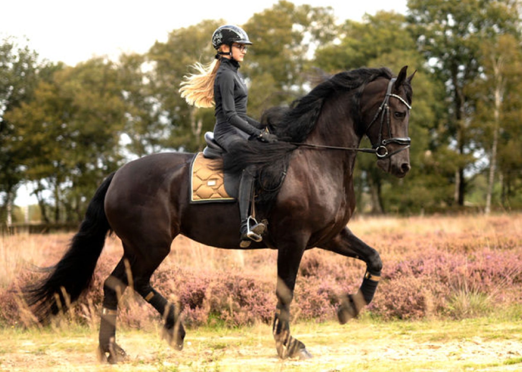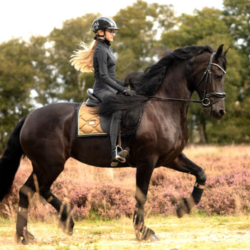 Tapis de selle de dressage exclusif en laiton doré brillant avec de beaux détails dorés. Le tapis de selle est fabriqué dans un matériau brillant et anti-salissures avec un séchage rapide à l’intérieur qui garde votre cheval au sec tout au long des séances de transpiration. Forme anatomique pour s’adapter parfaitement à votre cheval. Matelassé avec le motif élégant d’Equestrian Stockholm.