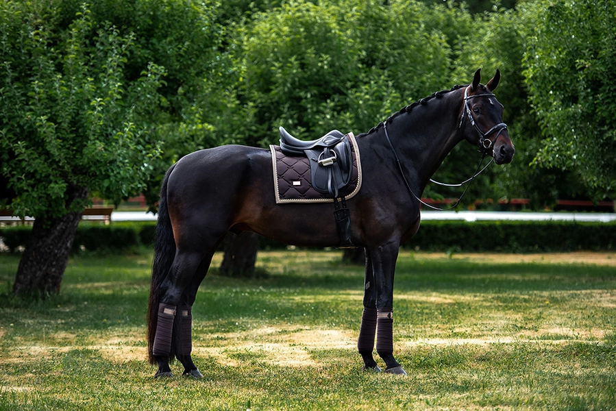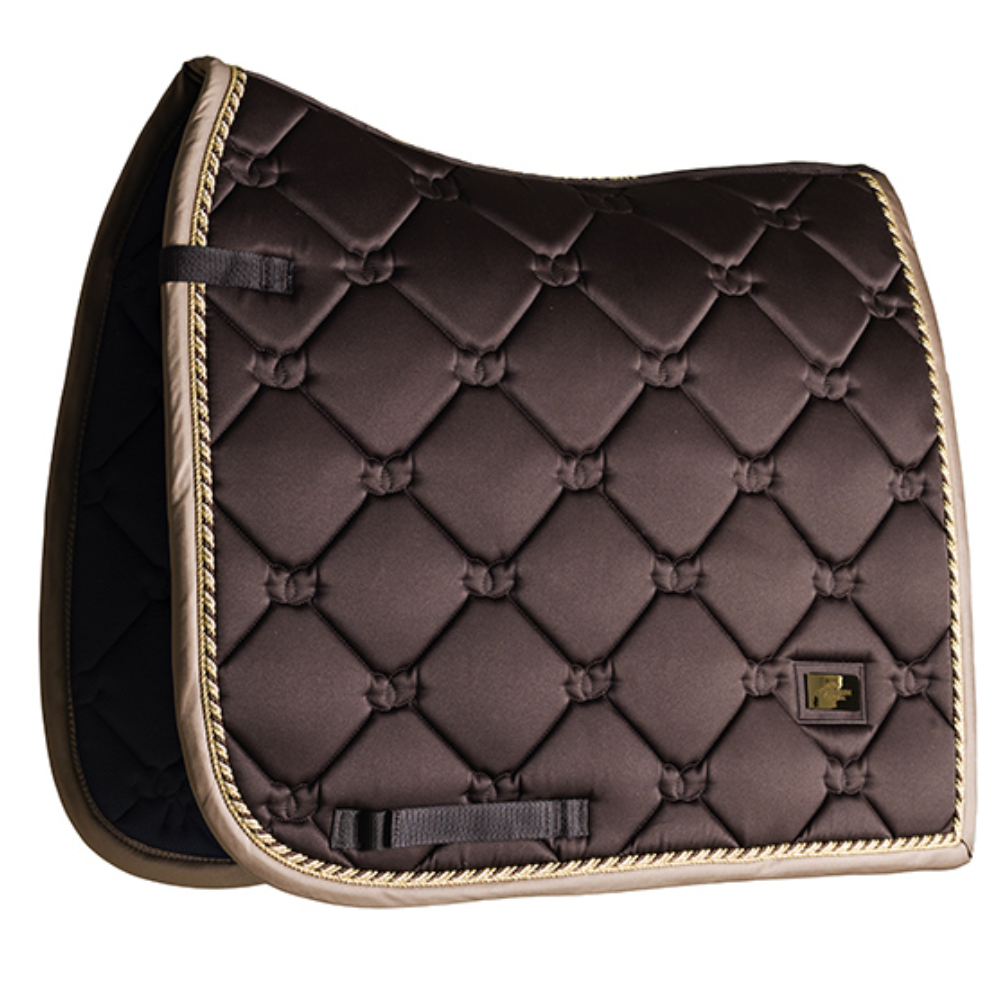 Le tapis de selle Golden Brown est un véritable coup de coeur dans le dressing des tapis de selle ! Notre tapis de selle de luxe en marron foncé brillant est parfait pour une journée d’entraînement ou de compétition. Le matériau intérieur a une fonction de «séchage super rapide» et gardera vos chevaux au sec pendant votre entraînement. Le tapis de selle est brillant et anti-salissures avec de beaux détails dorés et des motifs avec le logo Equestrian Stockholm.
