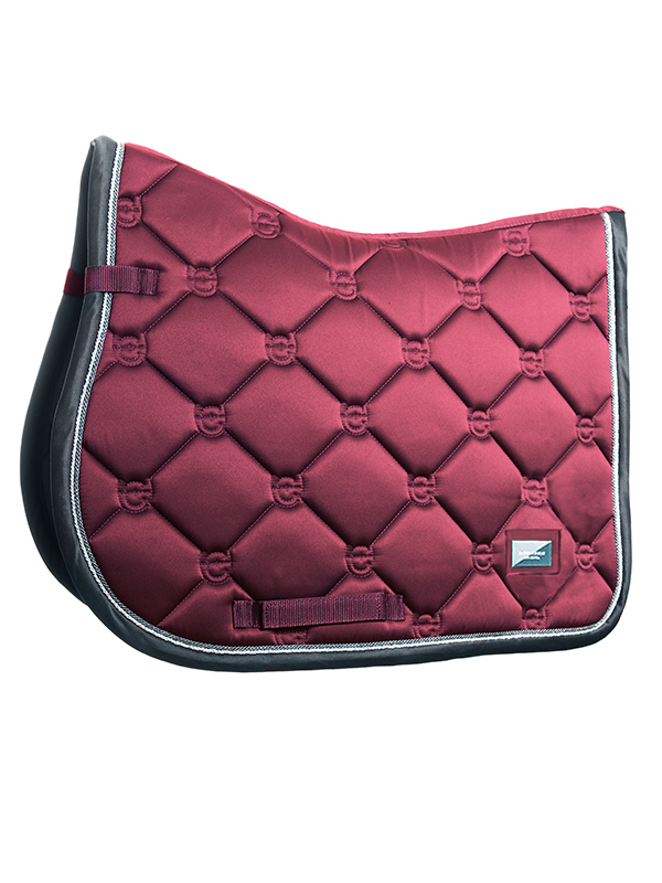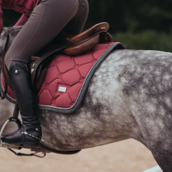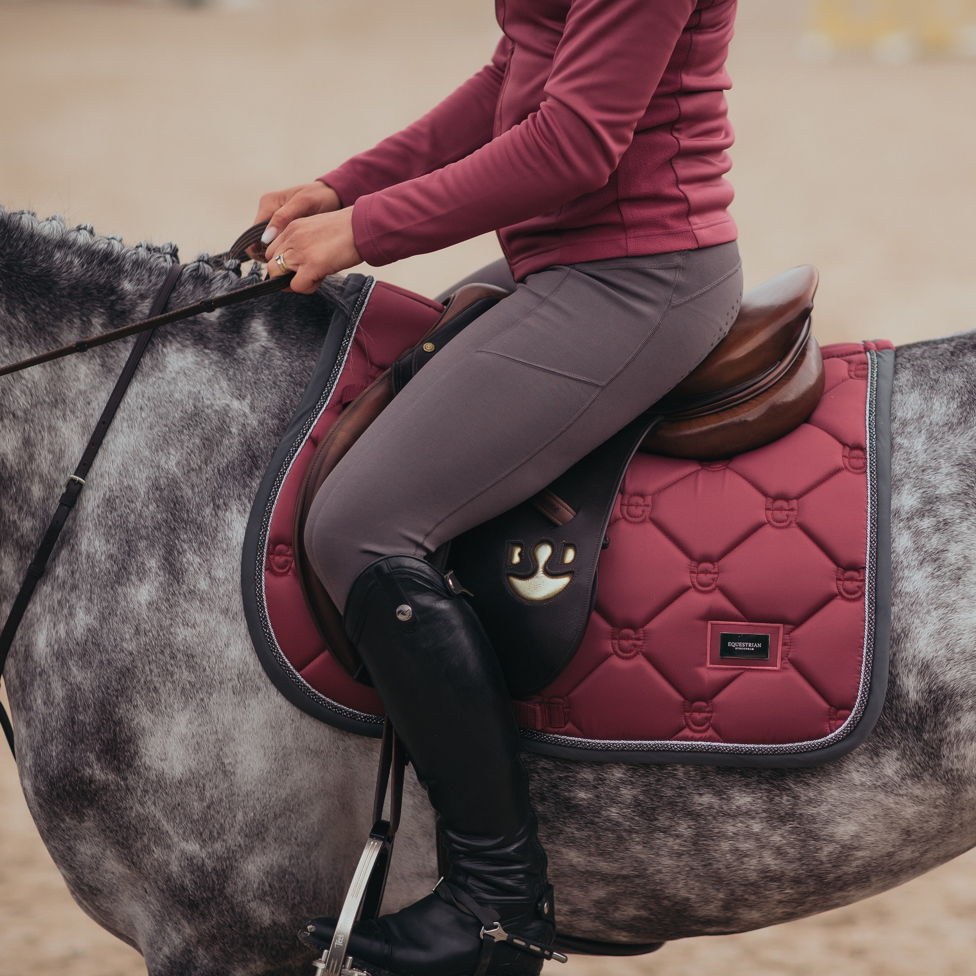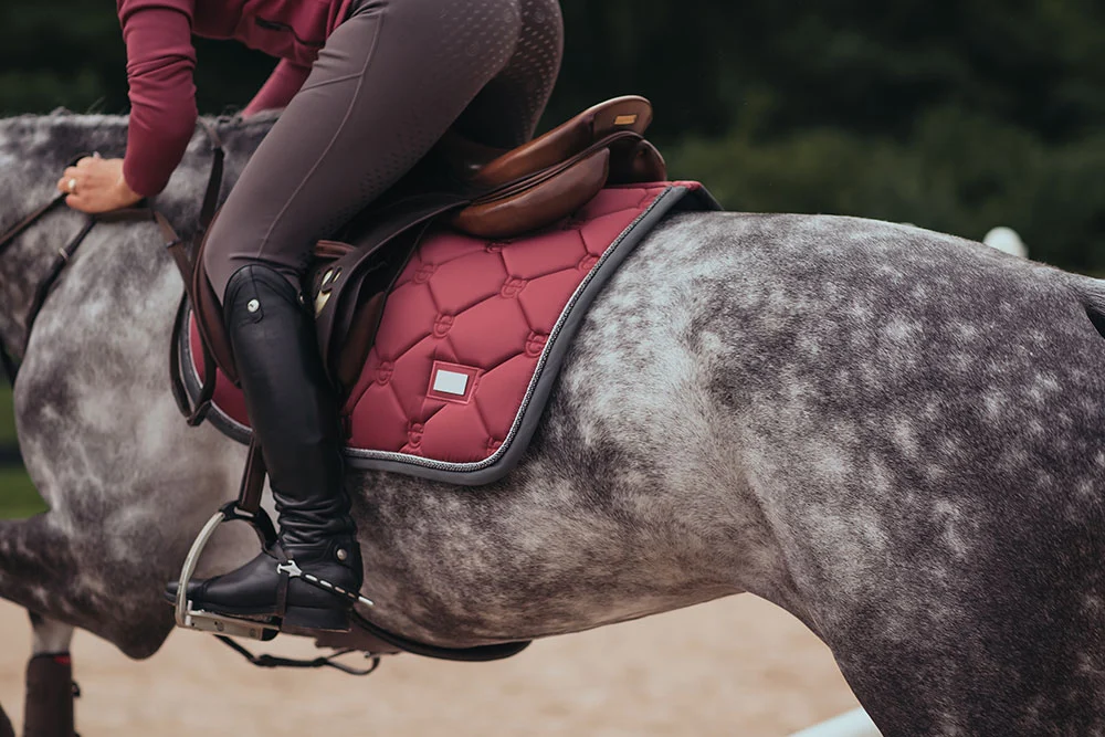 Le tapis de selle a une couleur rose plus foncée avec une reliure en gris foncé et des passepoils en argent et gris foncé, assortis à la reliure. Matelassé avec le logo élégant d’Equestrian Stockholm.