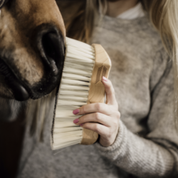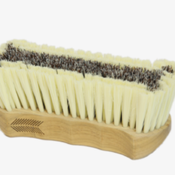 Cette brosse vernie possède de longs poils crèmes pour aider à enlever la saleté et les poils morts. Les poils en polypropylène sont souples, rendant cette brosse idéale pour une utilisation en été, lorsque le poil est plus fin, ou sur un cheval tondu. Les poils au centre sont également plus doux, pour une meilleure action de la brosse. Nettoyez votre brosse en la trempant dans l’eau chaude savonneuse et soyez certain de la garder pendant longtemps. Votre cheval deviendra la star des écuries grâce à cette brosse !