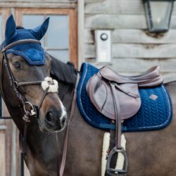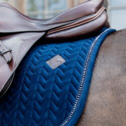 L’extérieur du tapis de selle est fabriqué à partir de notre célèbre et doux tissu velvet surpiqué en « Fishbone ». Le passepoil est terminé par des perles très chics. La doublure du tapis de selle est un mélange de coton et de polyester qui absorbe facilement la sueur et est très respirant.