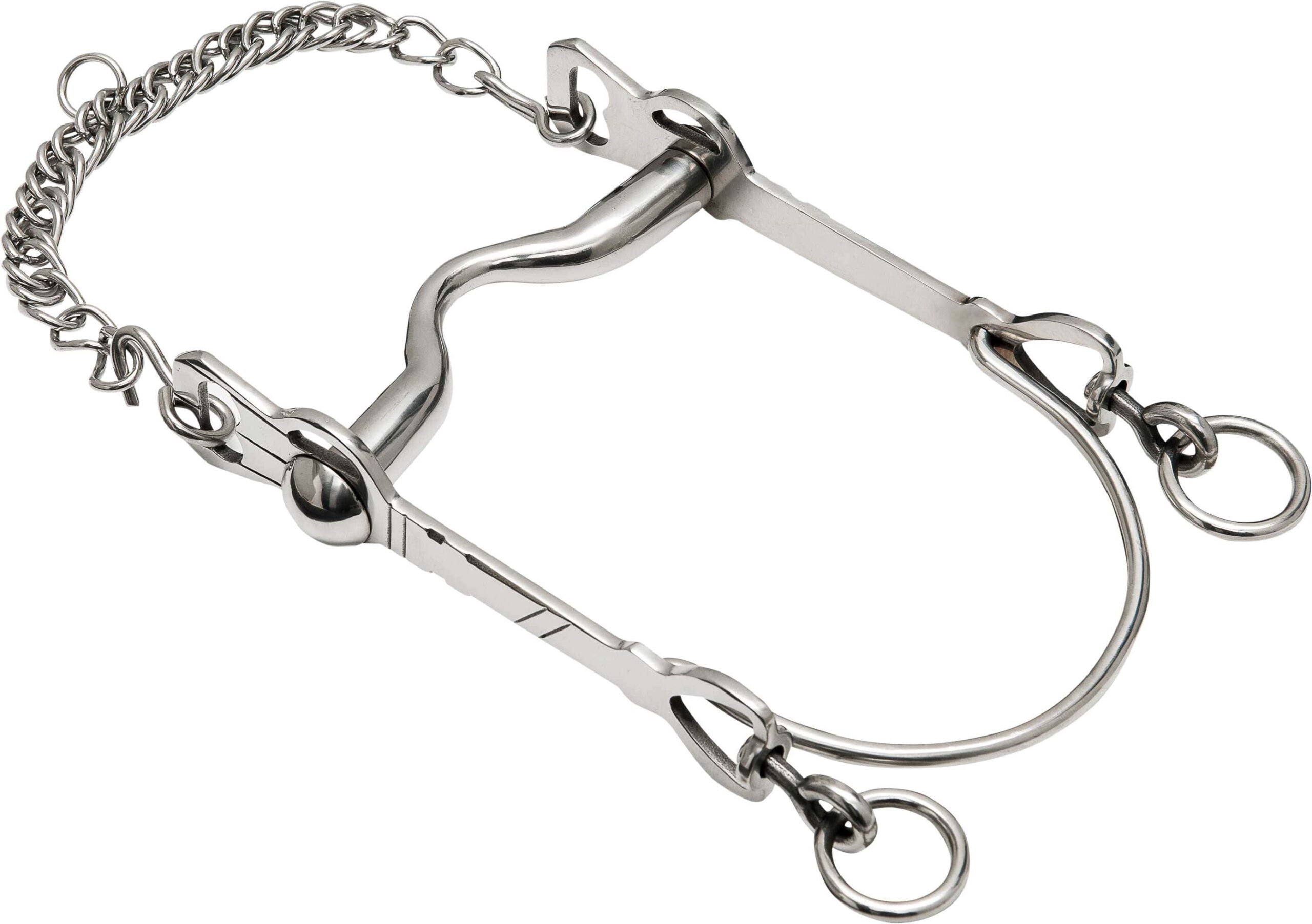 Polyvalence de réglage : Grâce à ses deux encoches sur les anneaux, vous pouvez fixer vos rênes en position haute (action douce proche du mors Verdun) ou en position basse (effet de levier accentué).