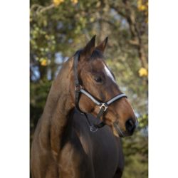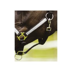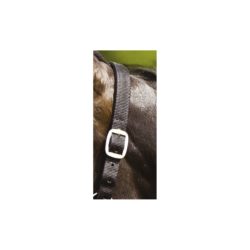 En polypropylène double épaisseur avec têtière et muserolle réglables par boucles, matelassées polyuréthane anti-frottements.