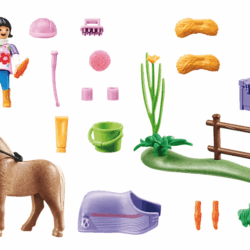 La petite fille prend bien soin de son poney Islandais. La boîte violette contient plusieurs accessoires pour ce dernier. Un petit coup de brosse et on part faire une balade !Contient un personnage et un poney.