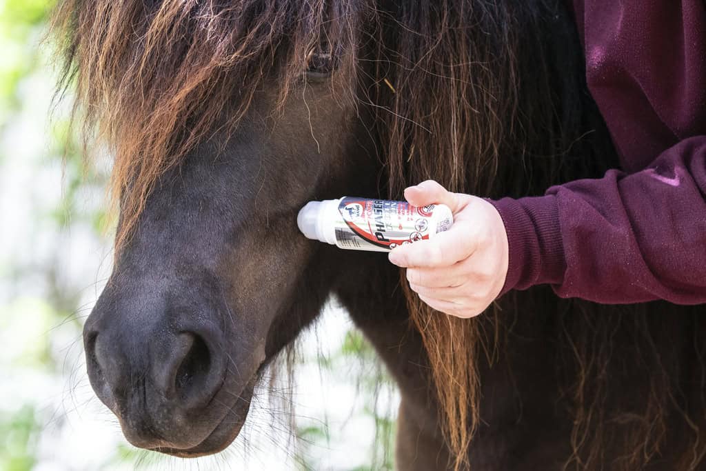 Chevaux et poneys : Appliquer directement sur les zones de peau exposées comme le cou, le ventre, et les jambes. Utiliser avant toute sortie extérieure ou travail dans des environnements infestés d’insectes.