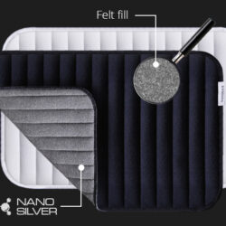 La couche inférieure de nos sous-bandes de travail Thermo Silver – c’est-à-dire la couche en contact direct avec la peau du cheval – est composée d’une matière technologiquement avancée contenant des ions d’argent, de la même manière que les produits de notre gamme NanoSilver. Les ions d’argent limitent la prolifération des bactéries, des virus et des moisissures et minimisent ainsi le risque d’infection cutanée au niveau des membres souvent fragiles. Les ions d’argent sont directement intégrés dans le fil et ne sont pas libérés sur la peau. Nos sous-bandes de travail sont donc particulièrement douces pour l’épiderme et n’ont aucun impact sur son pH naturel. Elles représentent la solution idéale pour les chevaux à tendance allergique. L’intégration des ions d’argent directement dans le fil leur permet en outre de conserver leur efficacité, même après plusieurs lavages.