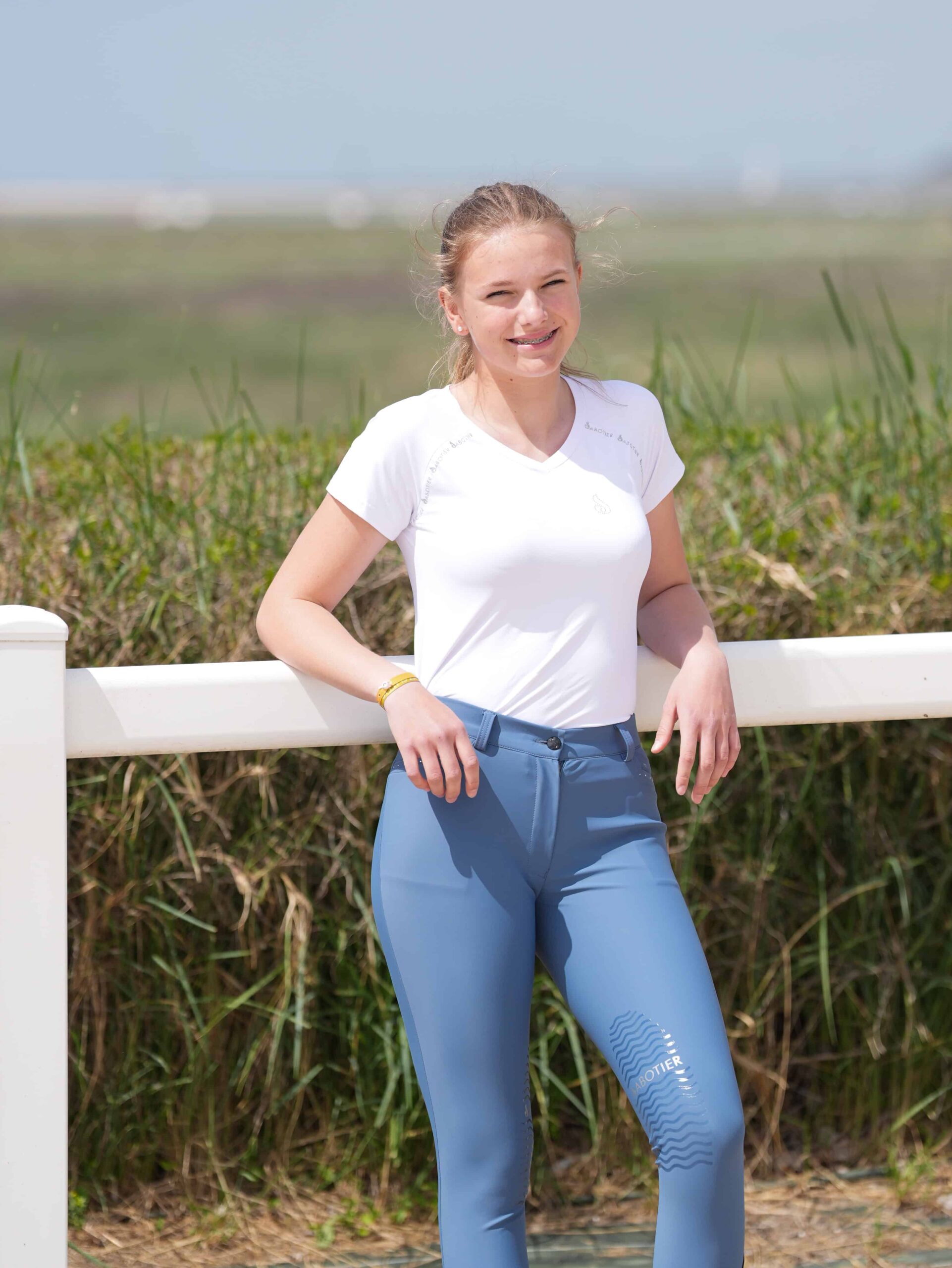 Ce t-shirt pour cavalière a été pensé comme un haut d’équitation confortable et élégant, à porter aussi bien à l’écurie qu’en ville. Grâce à sa matière en coton bio, il convient à toutes celles qui recherchent un vêtement équestre éthique. »